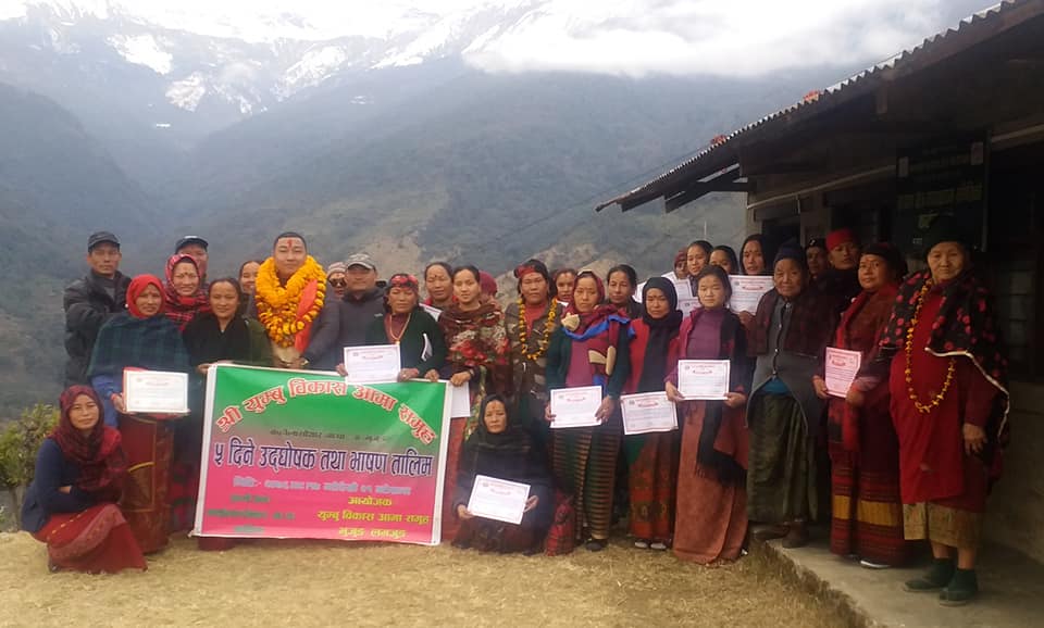 युम्बु विकास आमा समूह, भुजुङको आयोजनामा पुस १६ गतेदेखि सुरु भएको तालिम सोमबार सम्पन्न भएको हो । क्व्होंला सोंथर गाउँपालिकाको आर्थिक सहयोगमा सम्पन्न भएको तालिमको समापन गर्दै वडाध्यक्ष खिमबहादुर गुरुङले आमा, दिदीबहिनीहरूको क्षमता विकासका लागि तालिमले महŒवपूर्ण भूमिका खेल्ने बताउनुभयो ।