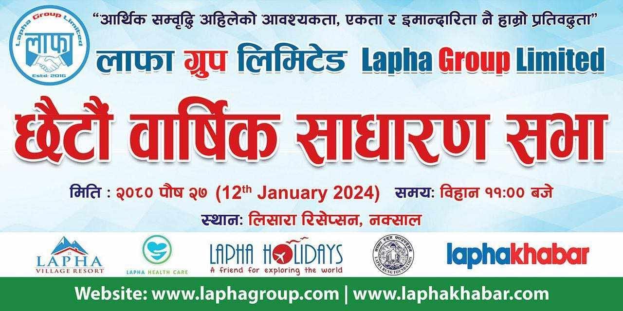 लाफा ग्रुप लिमिटेडको छैठौं वार्षिक साधारणसभा यही पुस २७ गते हुने भएको छ । कम्पनीको सञ्चालक समितिको बैठकले साधारणसभाबारे विभिन्न निर्णय समेत गरेको छ ।