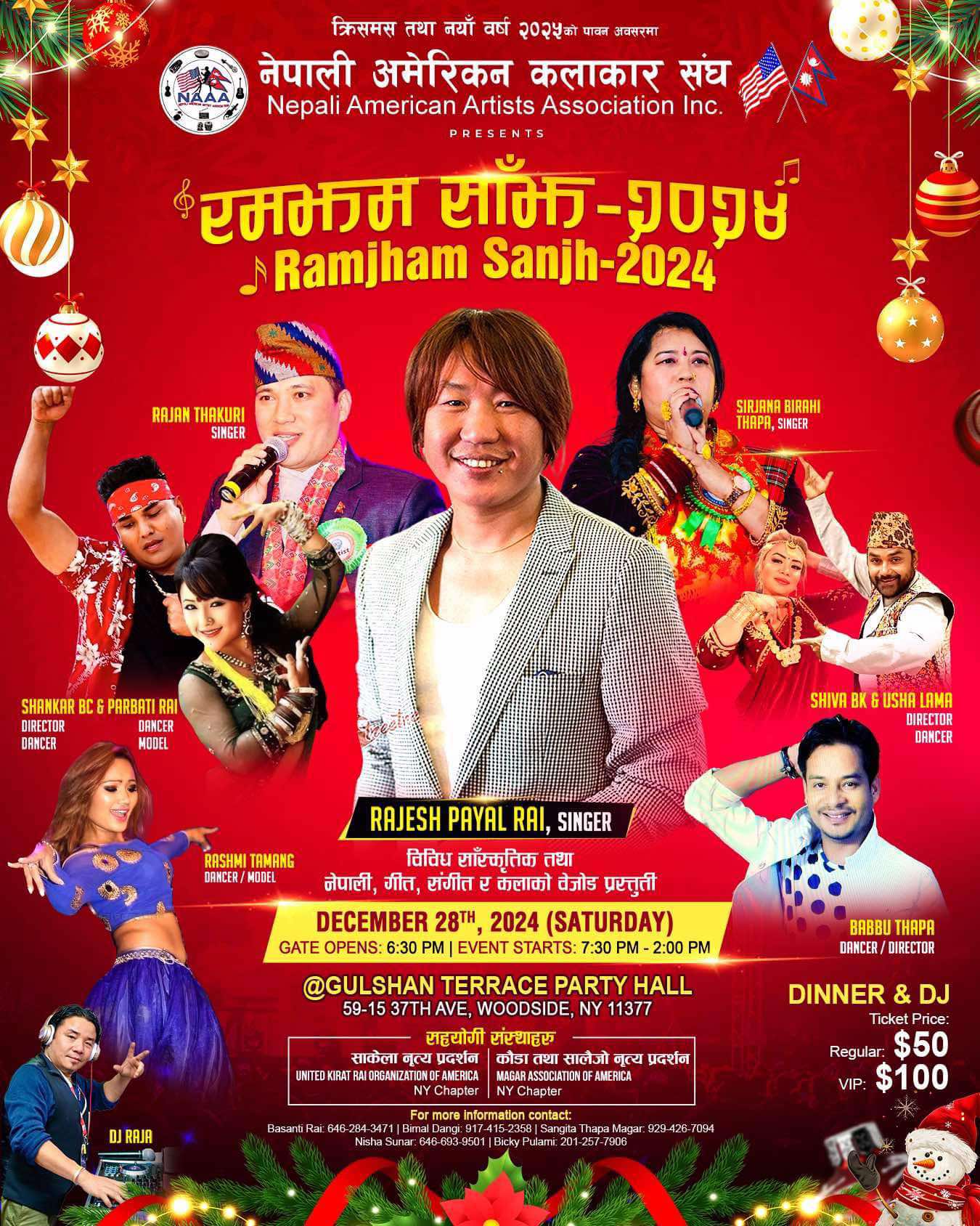 क्रिशमस तथा नयाँ वर्ष २०२५ को पावन अवसरमा नेपाली अमेरिकन कलाकार संघले साँस्कृतिक कार्यक्रम “रमझम साँझ २०२४” गर्ने भएको छ ।