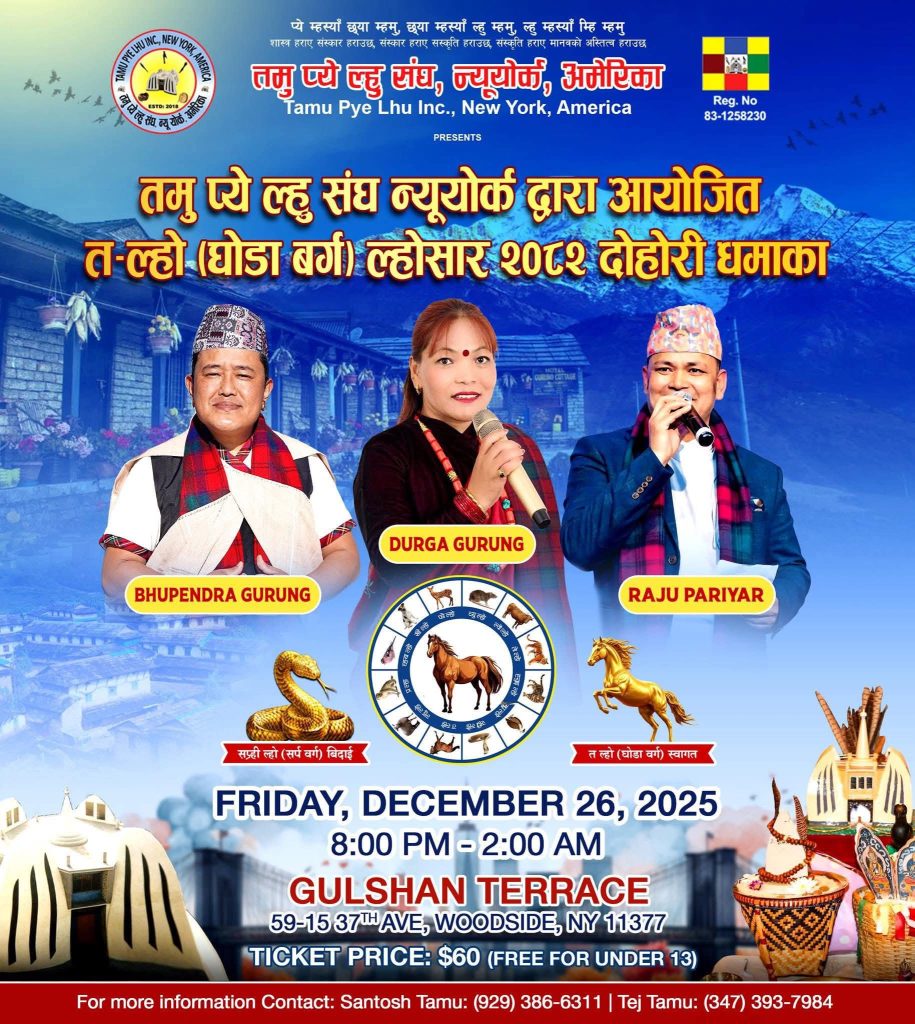 तमु समुदायको महान पर्व तमु ल्होसारको अवसरमा अमेरिकाको न्युयोर्कमा यसबर्ष पनि सर्प बर्गको बिदाई गर्दै घोड बर्गलाई स्वागत गर्दै तमु ल्होसार मनार्ईएको छ । तमु प्ये ल्हु संघ अमेरिकाको आयोजनामा त – ल्हो, २०८२ सांस्कृतिक कार्यक्रम गरी  न्युयोर्कस्थित वुडसाईडमा विविध कार्यक्रम सहित तमु ल्होसार मनाईएको हो ।